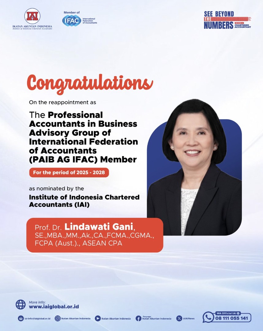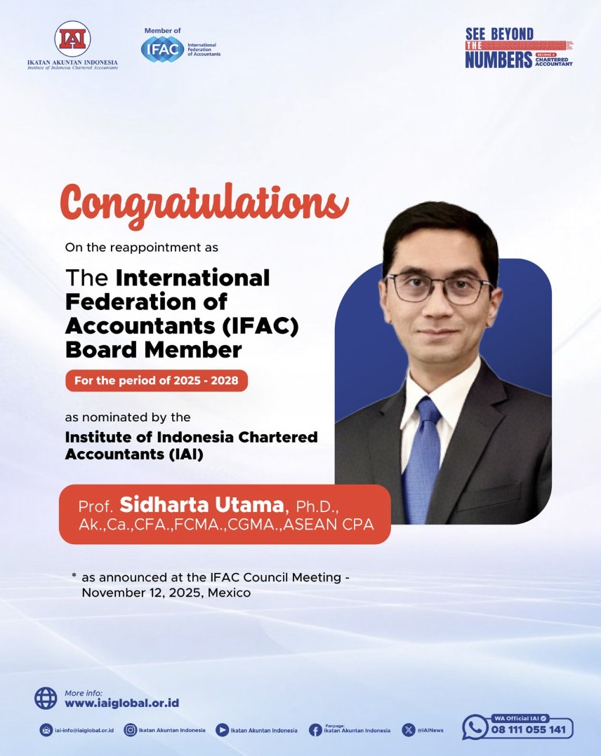 New York, Amerika Serikat – International Federation of Accountants (IFAC) mengumumkan kembali terpilihnya Prof. Sidharta Utama (Anggota Dewan Pengurus Nasional Ikatan Akuntan Indonesia/DPN IAI) sebagai IFAC Board Member dan Prof. Lindawati Gani (Anggota DPN IAI) sebagai Professional Accountants in Business Advisory Group (PAIB AG) IFAC Member. Keduanya akan bertugas dalam pengembangan profesi global di IFAC untuk periode 2025-2028.