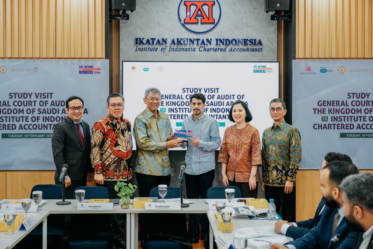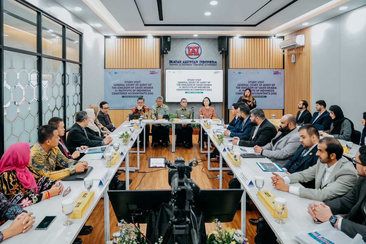 (Jakarta, 18 Februari 2025) – Ikatan Akuntan Indonesia (IAI), yang merupakan organisasi profesi akuntansi di Indonesia yang menaungi Akuntan Profesional dengan beragam latar belakang termasuk Akuntan sektor publik, menerima kunjungan studi General Court of Audit (GCA) dari Kerajaan Saudi Arabia di Grha Akuntan IAI Pusat, Menteng, Jakarta Pusat. Delegasi GCA KSA berjumlah 26 orang dipimpin oleh Mr. Abdulaziz Ibrahim Hamad Alabbas selaku kepala delegasi. GCA KSA merupakan counterpart dari Badan Pemeriksa Keuangan Republik Indonesia (BPK RI). Turut mendampingi dalam kunjungan ini rombongan dari BPK RI sejumlah 7 orang yang dipimpin oleh Firdaus Amyar selaku Kepala Pusat Akademik dan Teknologi Pembelajaran Badiklat PKN BPK.