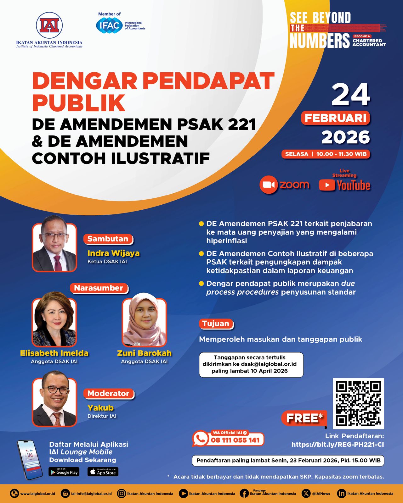 IAI mengundang para pemangku kepentingan dalam acara “Dengar Pendapat Publik DE Amendemen PSAK 221 & DE Amendemen Contoh Ilustratif” yang akan dilaksanakan pada: